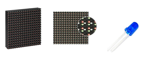 يتكون كل بكسل LED على سطح وحدة DIP LED من ثلاثة مصابيح LED: مصباح LED أحمر ، ومصباح LED أخضر ، ومصباح أزرق. يعمل RGB LED كأساس لأي شاشة LED ملونة. نظرًا لأن الألوان الأساسية الثلاثة (الأحمر والأخضر والأزرق) هي الألوان الأساسية في عجلة الألوان ، فإن لديها القدرة على إنتاج كل الألوان الممكنة بما في ذلك الألوان البيضاء.