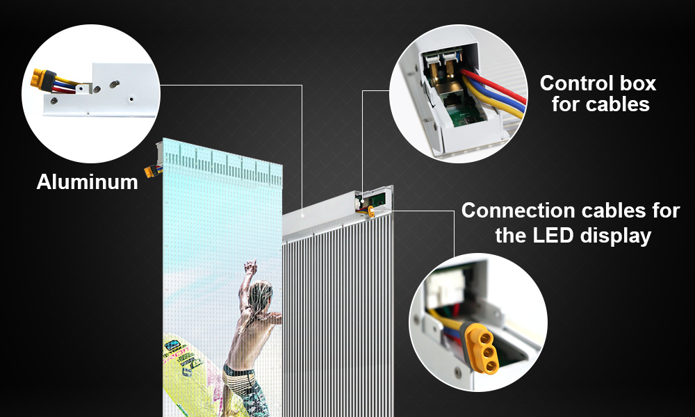 スクリーンは透明プレートを介して接続され、電源ボックスはプロファイルを介して接続されます。