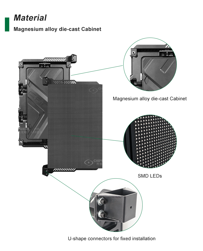 特徴: 1.高精度ダイカストアルミキャビネット:キャビネットは非常に軽くて薄いです。(キャビネット1個あたりの重量は8kg未満、キャビネットの厚さは79mm未満です。) 2 優れた互換性: C-Rock シリーズには 2 つのキャビネット サイズ (500mm * 500mm と 500mm * 1000mm) があり、異なるサイズの複数のキャビネットを上下に接合して、ユーザーの組み立てニーズを満たすことができます。 3 素早い分解:すべてのキャビネットには素早い分解を容易にするクイックリリースコントロールボックスが装備されています。 4 アーク ロックによる接合 (オプション): アーク ロックを使用してキャビネットを接合し、-10° ~ 15° をサポートする曲面スクリーンを作成することもできます。 5 フロントサービス:C-Rock シリーズはフロントメンテナンスをサポートする磁気モジュールを採用しています。 6 各キャビネットには、移動中の振動による組み立てエラーを防ぐための 2 本の固定ネジが装備されており、アプリケーションの寿命とパフォーマンスを保証します。 7 簡単な操作: 1 人でもキャビネットの設置を素早く完了できるため、設置コストを大幅に削減できます。 8 静音動作: モジュールは熱を放散するためのファンを使用しません。動作中の騒音レベルは常に 40db 未満で、ライブのオーディオ ビジュアル効果に影響を与えません。 9 大型ステージの背景スクリーンとして最適: C-Rock シリーズの LED ディスプレイ スクリーンには DSLR 背景効果があり、その高いリフレッシュ レートにより、ゴーストやちらつきなしで最大 1/3000 秒のカメラのシャッター スピードに追いつくことができます。 10 屋内および屋外での使用が可能:舞台公演、会議、イベント用の総合的な LED ディスプレイ ソリューションとして、屋内用の C-Rock シリーズはピクセル ピッチ 1.95mm、2.604mm、3.91mm で提供され、屋外用の C-Rock シリーズはピクセル ピッチ 2.604mm、2.97mm、3.9mm、4.8mm で提供されます。