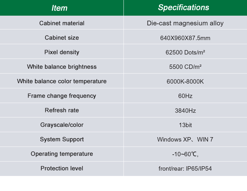 1 高輝度、省エネ:この C-Fit シリーズは、優れたエネルギー効率を提供する 2.8V/3.8V 低電圧電源を採用し、一方、ICE LED ビーズは低消費電力で高輝度を実現します。 2 高画質: リーディングエッジブランキング回路を採用し、ゴーストラインを効果的に除去します。ホワイトバランスを低階調に設定することで、色ずれのない高画質な画質を実現します。 3 超薄型: キャビネットはダイカストマグネシウム合金を使用しています (空のキャビネットの重量: 15kg、完成したキャビネットの重量: 35kg、キャビネットの厚さ: 87mm)。これにより、キャビネットの輸送と設置が簡単になります。 4 高精度: すべてのキャビネットはダイカストプロセスと CNC プロセスを通じて製造されているため、すべてのキャビネットをシームレスに接合できます。 5 高い保護レベル: キャビネットの前面の保護等級は IP65 に達します。 C-Fit シリーズ LED スクリーンは、一般的な屋外条件に耐えることができます。6 高効率の放熱: 独自開発の放熱システムにより、キャビネットの隅々にある熱が 2 倍の電流と負圧によって素早く放散されます。これにより、LED スクリーンが熱放散の問題なく常に正常に動作できるようになります。 7 迅速な取り付け: すべてのキャビネットは高速ロックで接続されており、2 つのキャビネットを接続するのに 10 秒しかかかりません。 8 幅広い用途: C-Fit シリーズは、壁掛け/吊り下げディスプレイ スクリーンとして、スタジアム、ショッピング モール、埠頭、バス停、学校、道端など、さまざまな屋外の公共の場所で広く使用できます。