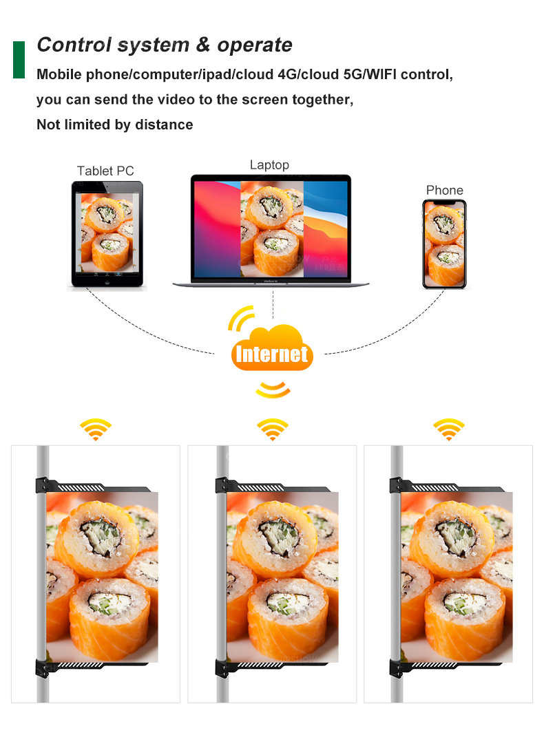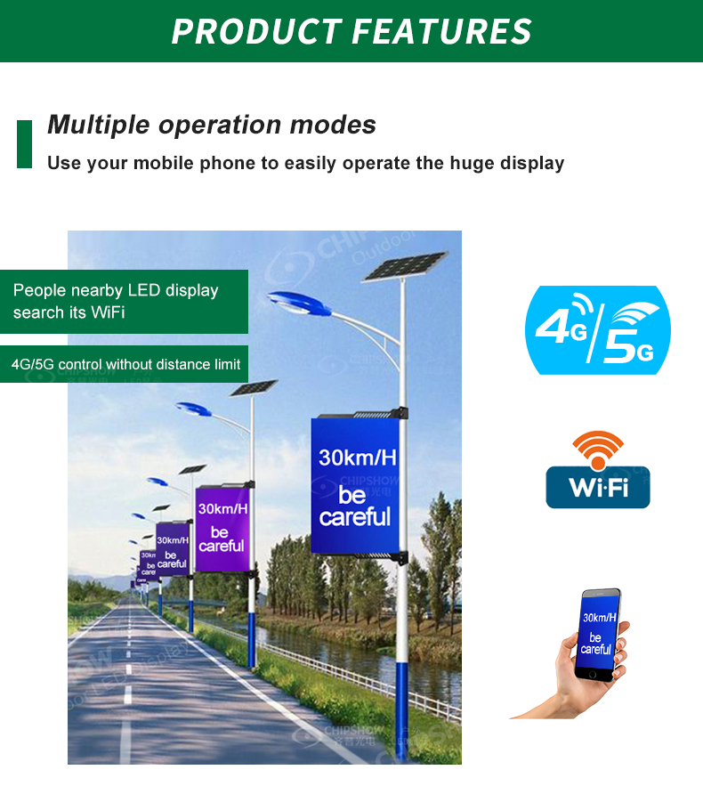 4 4G/5G ネットワークリモコン: C-Fit-Pole シリーズを使用すると、ポール LED スクリーンの数に制限がない大規模なネットワークを構築できます。さらに、高速データ転送により、アニメーション、ビデオ、高解像度の写真を簡単に送信できます。