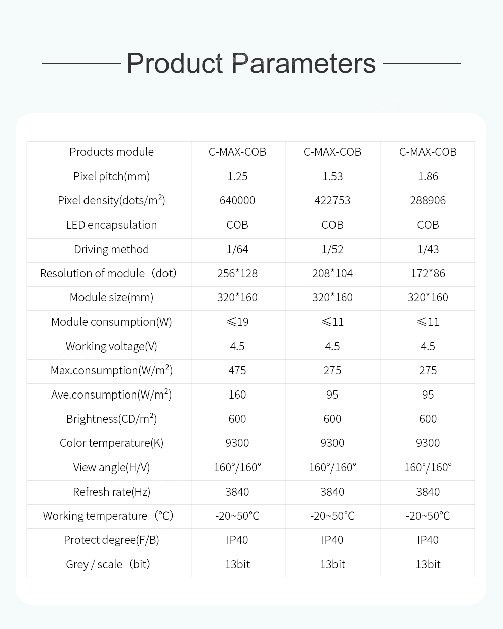 3 優れた互換性: C-Max COB シリーズのピクセル ピッチは 1.25mm、1.53mm、1.86mm で提供され、キャビネットは当社の C-Max シリーズ (P1.2/1.3/1.5/1.6/1.8/2/2.5/3/3.3/4) モジュールと互換性があるため、より高画質を実現するためにソリューションをさらにアップグレードする場合、キャビネットにかかるコストを大幅に節約できます。
