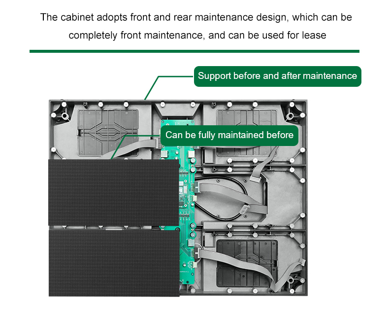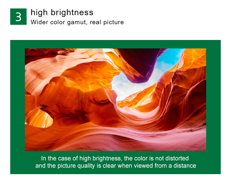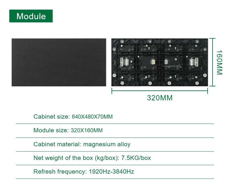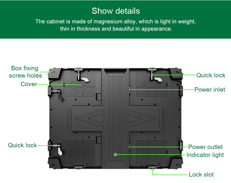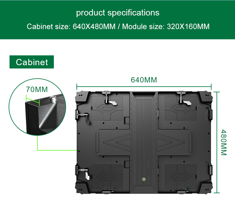• キャビネットサイズは640x480mmで、4:3および16:9のさまざまなLED大型スクリーンを組み立てることができ、壁に直接取り付けることができるため、スペースと労力を節約できます。