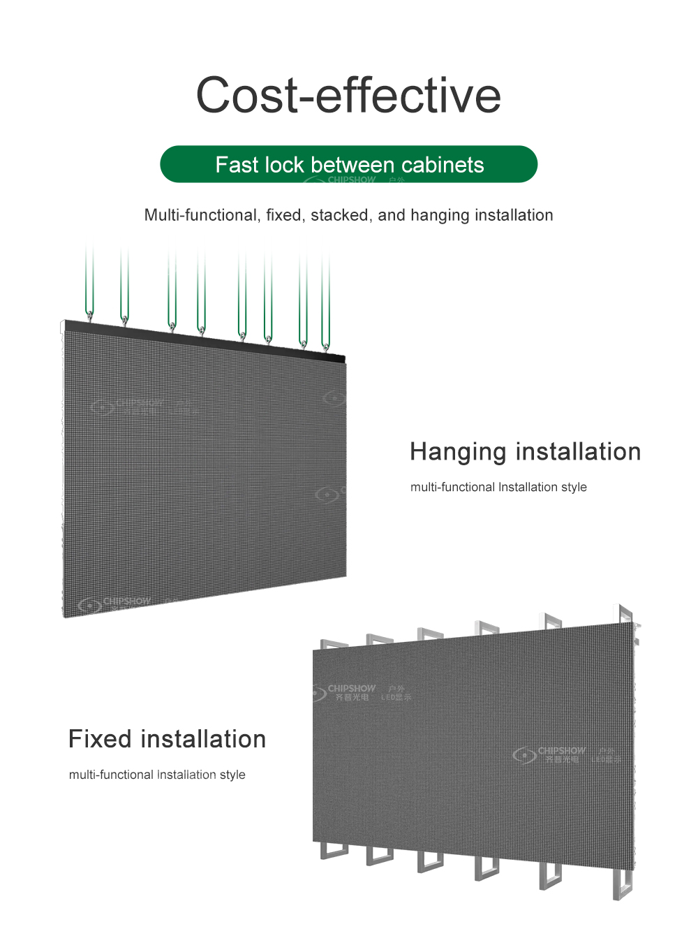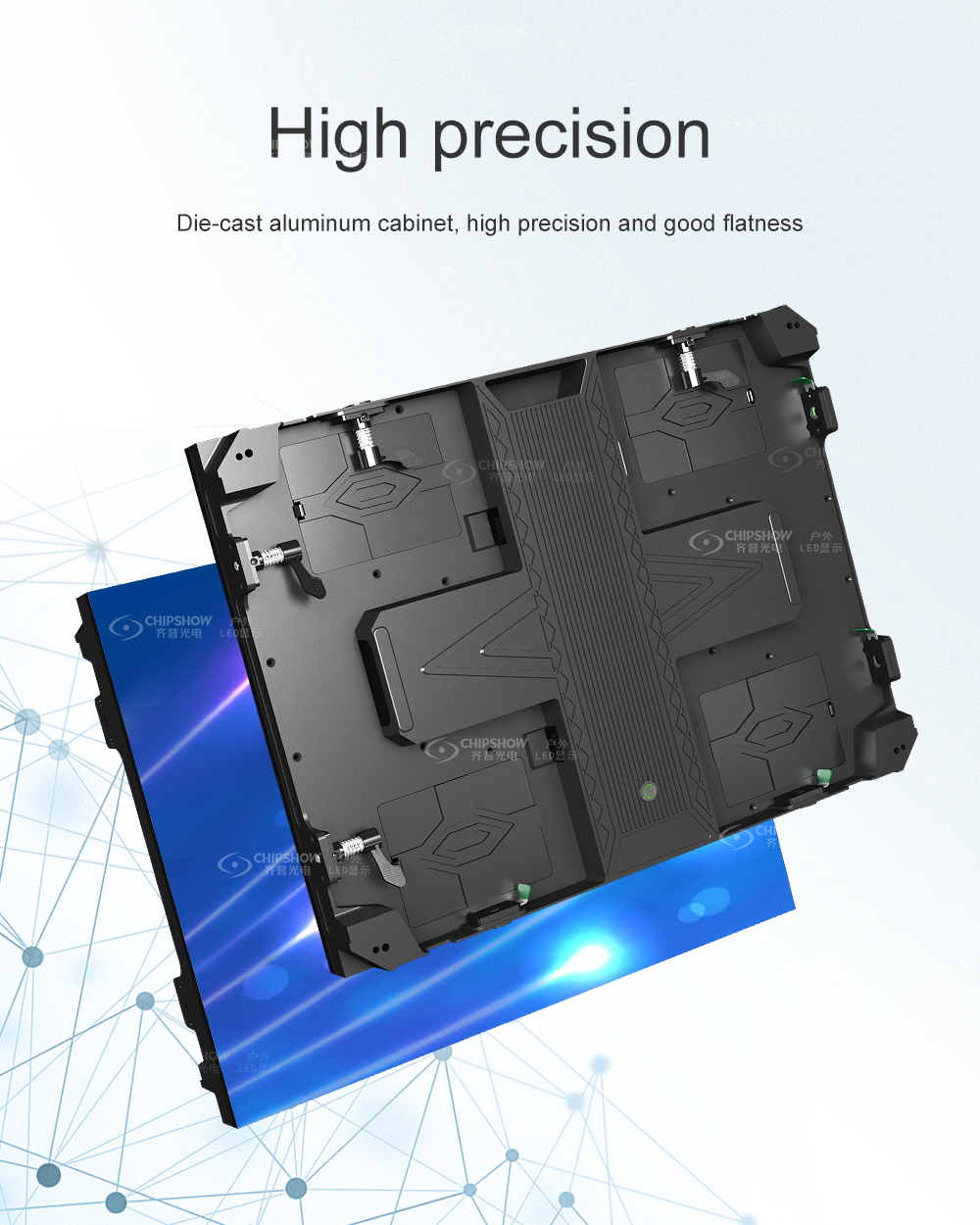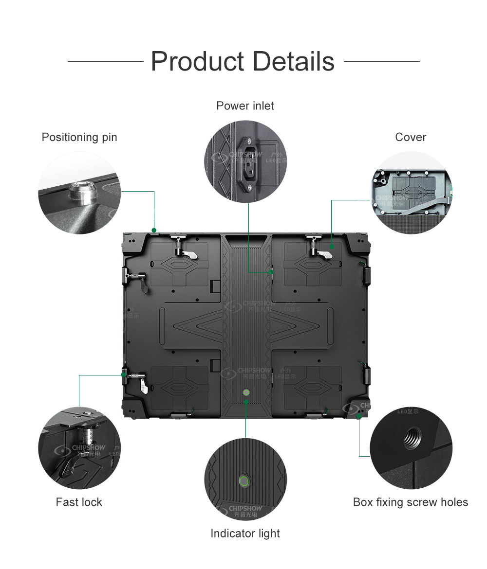 モジュールの特徴: 1、簡単:モジュール設計、組み立てとメンテナンスが簡単。 2、モジュールサイズ:250*250mm、滑らかな表面、モジュールギャップが小さい、高精度 キャビネットの特徴: ●ライト:キャビネットサイズ:500*500*86mm、重量:8.5kg/個。 ●薄型:アルミダイカスト設計、高精度、厚さわずか86mm。 ●速い:速いロック、組み立てと分解が簡単です。 ● 互換性:P2.6、P3、P3.91、P4、P5、P6の画素ピッチに対応。 ● 低:優れた冷却設計で、ファンやエアコンは不要です。 ノイズレス、低消費電力、コスト効率に優れています。