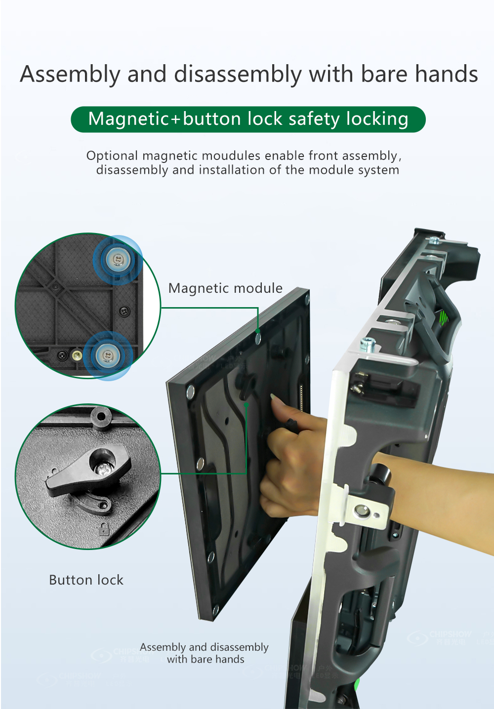 モジュールの特徴: 1、簡単:モジュール設計、組み立てとメンテナンスが簡単。 2、モジュールサイズ:250*250mm、滑らかな表面、モジュールギャップが小さい、高精度 キャビネットの特徴: ●ライト:キャビネットサイズ:500*500*86mm、重量:8.5kg/個。 ●薄型:アルミダイカスト設計、高精度、厚さわずか86mm。 ●速い:速いロック、組み立てと分解が簡単です。 ● 互換性:P2.6、P3、P3.91、P4、P5、P6の画素ピッチに対応。 ● 低:優れた冷却設計で、ファンやエアコンは不要です。 ノイズレス、低消費電力、コスト効率に優れています。