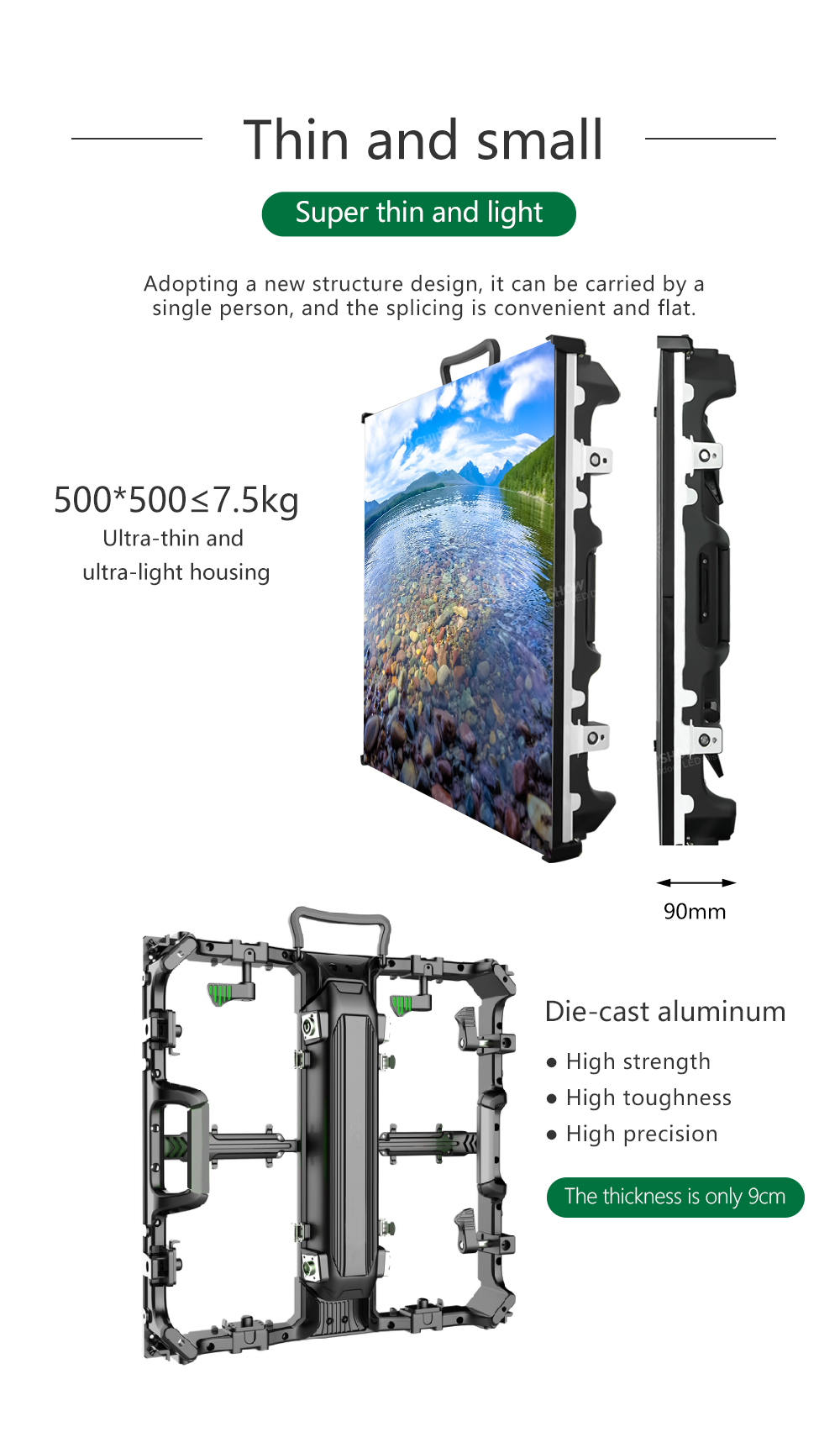 1.高精度鋳造アルミニウムキャビネット、超薄型軽量、500 * 500 ≤ 7.5KG/キャビネット、厚さはわずか90mmです。