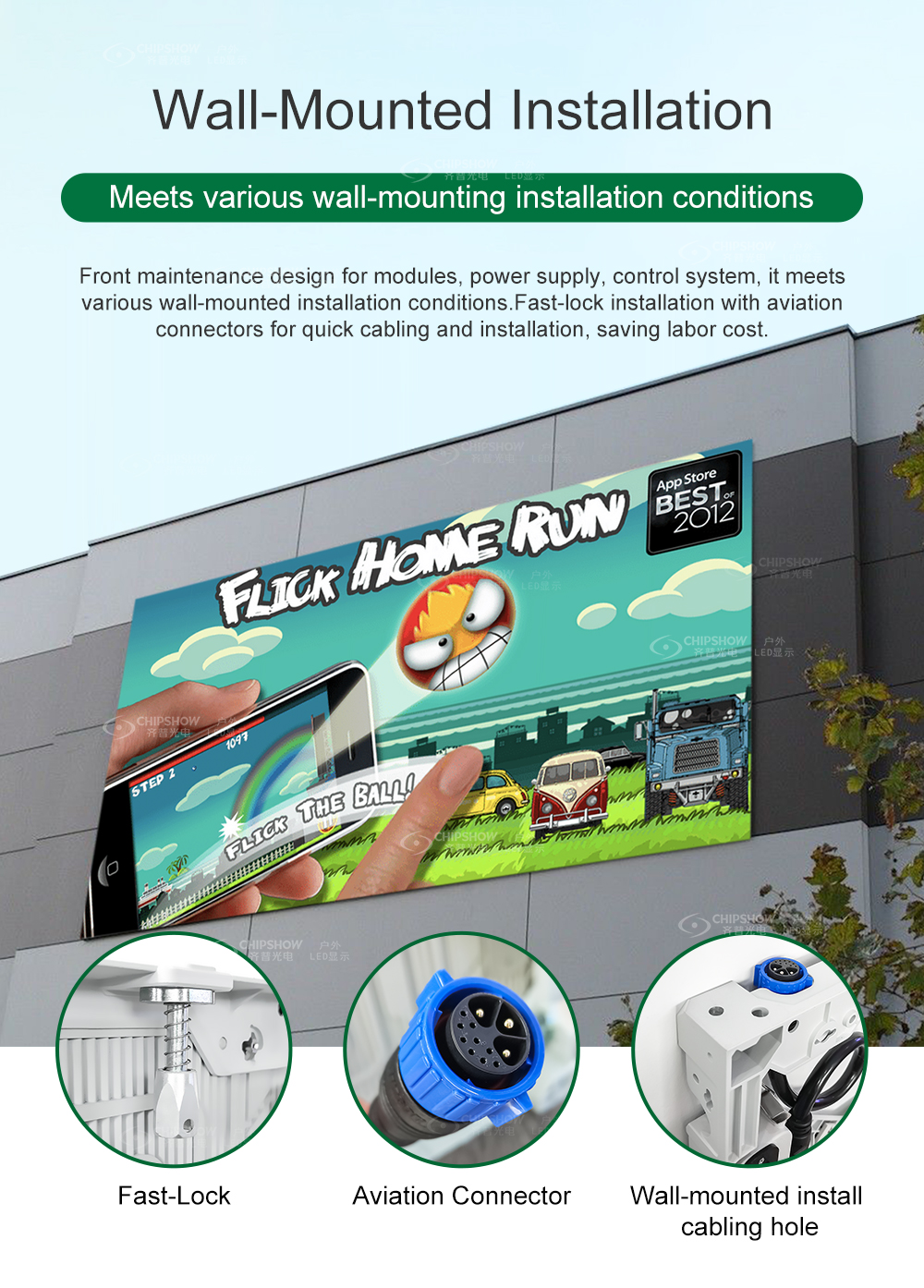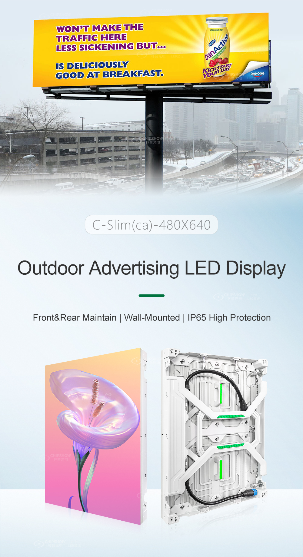 製品機能:1高​​精度:キャビネットは高圧ダイキャスティングアルミニウムを採用し、 許容範囲は0.1mm未満です。これにより、キャビネットの正確な組み立てが保証されます 画面全体の表面には平坦さが良好です。 2ウルトラ薄膜と超光:キャビネットは、鉄のキャビネットよりも重量が15kg/¡20%薄いです。これはあなたを助けます 大いに のコストを削減します 交通機関、 鋼フレーム構造の建設コスト 3複数の目的:C-FITビルボード画面はできます 使用されます 費用対効果の高い固定ディスプレイソリューションとして、吊り下げの設置をサポートするレンタルディスプレイソリューション、およびスタジアム周辺フェンスのディスプレイソリューション。 4フロントサービス設計:LEDモジュールは、フロントサービスをサポートします。したがって、壁に取り付けられたインストールに関しては、できます 簡単に モジュールを組み立てて分解します。 5簡単なアップグレードと交換:キャビネットは、P4〜P20モジュールに適応できます。したがって、ビルボード画面のアップグレードを検討する場合、キャビネットの交換に余分なコストを費やす必要はありません 6高輝度:輝度レベルは5500 cd/ã¡に達します。下にいても 強い 軽い、ビルボード画面はまだクリア画像を表示できます 7高保護グレード:C-Fit-Easyシリーズの保護グレードに到達 IP65; そして、このタイプのビルボード画面は、屋外LEDなどの大型の屋外広告に非常に適しています 壁、 グラウンドスタックシステムを備えたLED画面