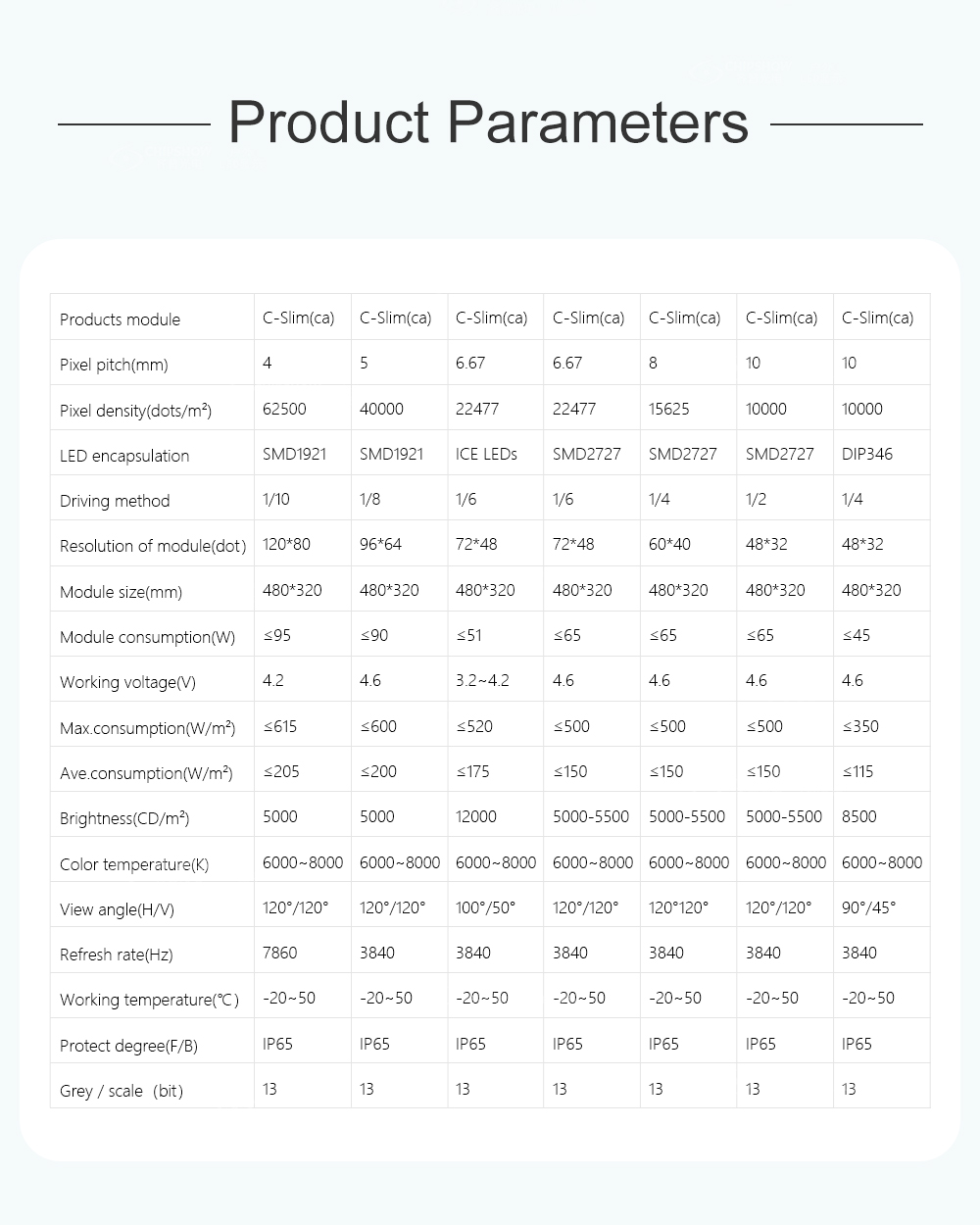 画素ピッチ、解像度、サイズ:5mm、12*64ドット、60*320 ピクセルカラー、ピクセルLEDL:1R1G1B、SMD1921 動作電圧、モジュール電力: DC4.6V、≤10W 駆動IC、駆動ウェイ 標準構成:ICND2153、1/8 ハブ: ハブ75 材質、キャビネット重量(kg/キャビネット): 板金アルミニウム、15kg/キャビネット 解像度、サイズ、モジュール数: 120*192Dots、600*960*95mm、10X3 密度: 40000ドット/㎡ ホワイトバランス、色温度:5000CD/㎡、6000-8000K ビューアングル、非平面度、モジュール間隔 H/V:120°/120°、<0.2mm、<0.2mm 最大電力/㎡、平均電力/㎡: ≤560W/㎡、≤170W/㎡ フレーム周波数、リフレッシュ周波数、グレーグレード:60Hz、3840Hz、13bit 制御システム、システムはCHIPSHOW、Windows XP、WIN 7をサポート 使用温度、保護等級:﹣20~50℃、前面/背面:IP65/IP54