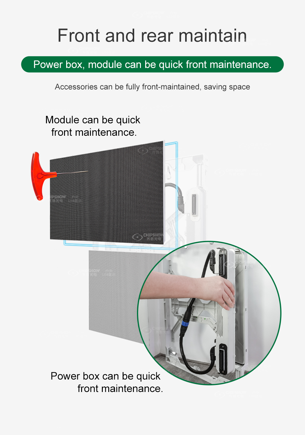 C-Easy P5、P6.67、P8、P10、P16 は、フロントおよびリアの保守可能、省エネ、屋外防水交換可能な LED モジュールです。 利点: 1. 省エネ≧30%。 2. 明るさ≤8500Nits 3. 高精度、高平坦度。 4. 交換可能なモジュール、迅速かつ簡単に交換可能。 5. フロントとリアのサービス。 6. IP65保護等級 7. 320*320mm モジュールサイズ、さまざまなサイズの画面に組み立てることができます。