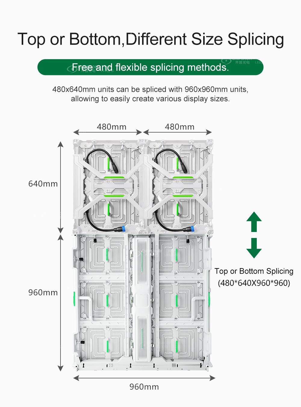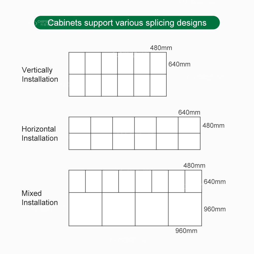 柔軟な組み立て: ユニットサイズが小さい (480mm * 640mm) ため、さまざまなサイズの標識/看板/広告板を組み立てるときに便利です。また、C-Slim 大型キャビネット (サイズ: 960mm * 960mm) との接合もサポートされており、たとえば、アスペクト比 16:9 のディスプレイ画面を簡単に接合できます。