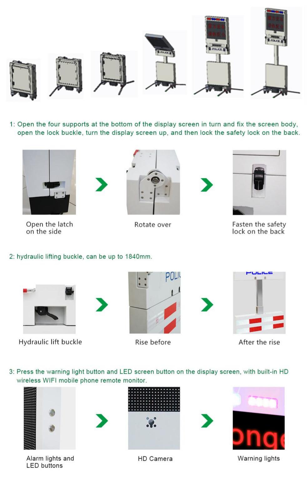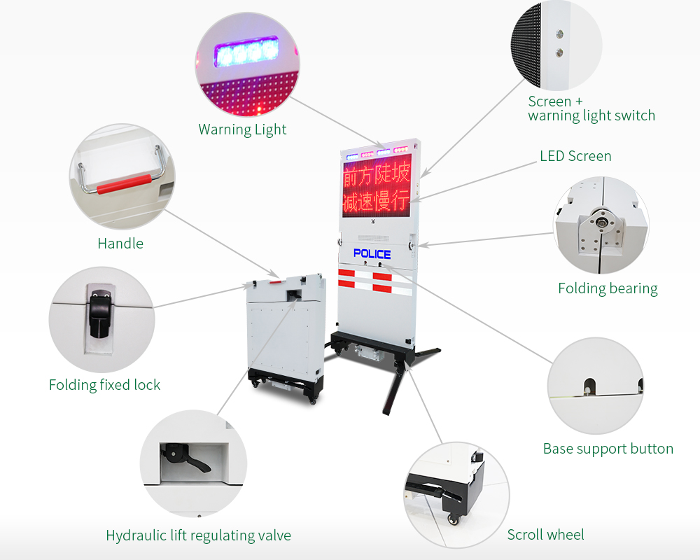 高輝度と省エネ: 2.8/3.8V 低電圧電源、ICE 高輝度ランプ、輝度を自動的に調整します。 HDディスプレイ:210メートル以上(車速) 120) をダイナミックに表示し、250 メートル以上離れた場所でもはっきりと見ることができます。 霧の天候における静的距離。道路状況を引き続き表示できます。 高解像度で車両が安全かつ効率的に通行できるように警告および誘導します。 効率的な放熱:大流量 キャビネット内の負圧放熱、効率的な熱排出、 LED ディスプレイの動作がより安定しました。 ソーラー充電+9.6KWH大容量 LED ディスプレイに 365 日継続的に電力を供給できるバッテリー。 油圧リフティング + 回転構造;の 画面全体が高さ 1M、360° でホバリングし、任意の高さで情報を再生します 二重安全牽引構造、10mm安全 チェーン、80 レベルの牽引フック リング、安全で便利なドラッグ機能付き。 7芯信号コネクタでEMARK制御可能 認定トレーラーインジケーター、ブレーキライト、ターンライト、サイドライト 車両全体 GPS測位をサポートします。サポートU ディスク/携帯電話/タブレット/コンピュータ/4G/WiFi 再生;サポートビデオと画像 MP4/AVI/jpg/ などの再生; 主に高速ガントリーや Fフレーム交通誘導;道路補修車両の安全警告標識、 清掃車両、衛生車両、その他の道路運営車両。