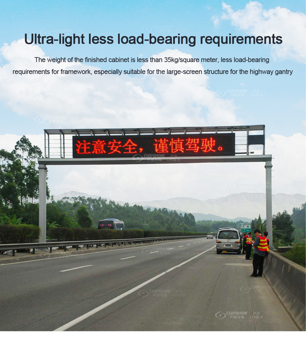 6 超軽量: 完成した各キャビネットの重量は 35kg/㎡ 未満であるため、支持構造の強度に関する厳しい要件がなく、高速道路上の大型 LED ディスプレイ スクリーンとして非常に適しています。