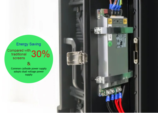 2. エネルギー消費と電力供給: C-Slim は輝度を上げた後も、価格を上げずに素材を追加でき、平均消費電力が 180W/㎡ 未満の低エネルギー屋外スクリーンの仲間入りを果たします。。その理由は、この屋外ディスプレイが、LED ディスプレイの省エネを達成するための共通アノード構造の改良に基づく技術的解決策であるコモンカソード電源方式を使用しているためです。R、G、B チップの電流と電圧を分配します。電流はまずランプビーズを通過し、次に IC の負電極に流れ、順方向電圧降下と導通の内部抵抗が減少します。効果。そこで、電源には二電圧電源方式を採用し、自動的に二出力を展開する機能を備え、電源の安定性を確保しました。