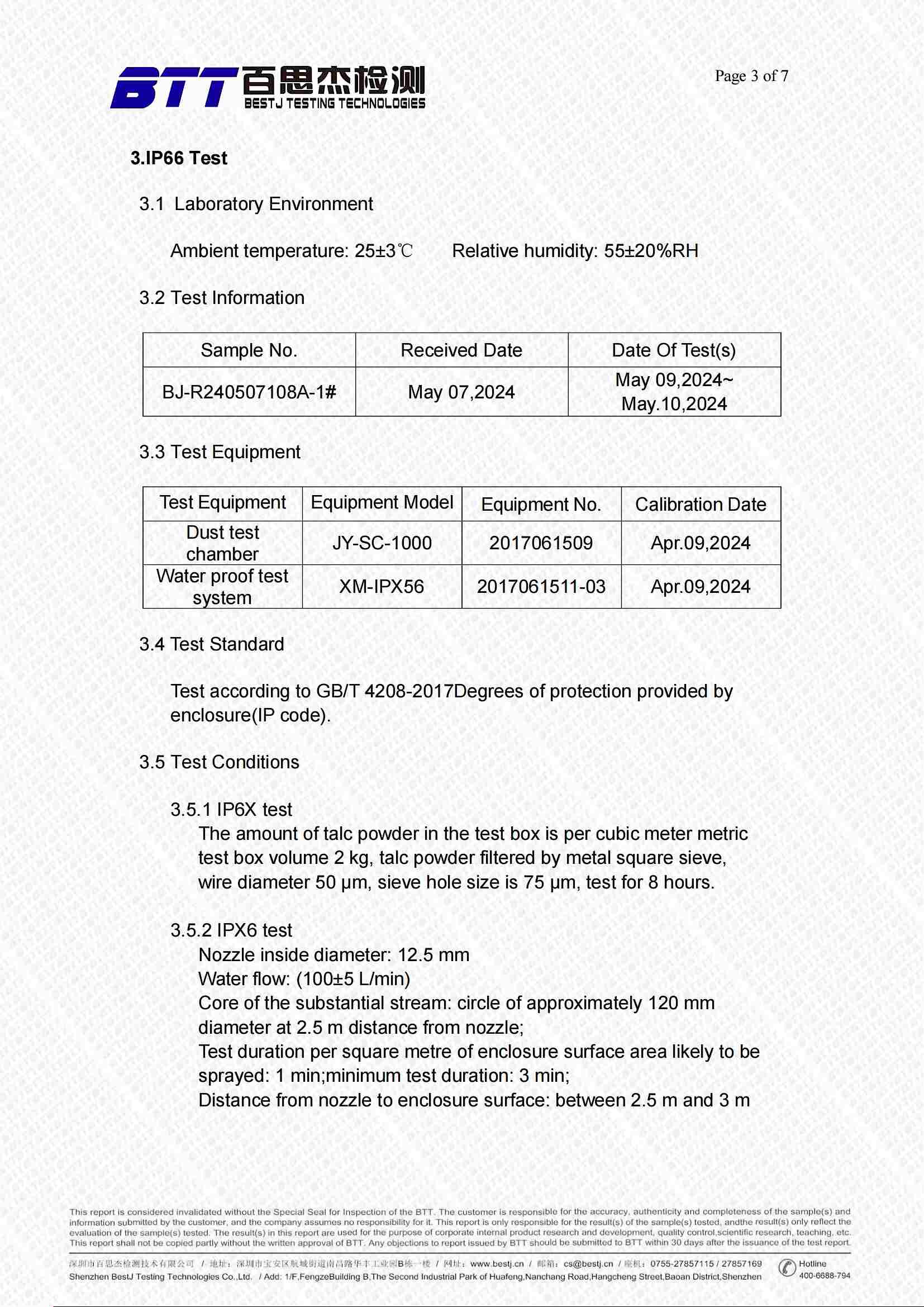 (試験報告書番号:BJ-R240507108A-EN)は、過酷な屋外環境における耐久性を検証しています。この認証は2024年5月に実施され、以下の規格への適合性を確認しています。