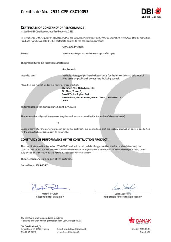 数日間にわたるテストと検証を経て、「Chipshow VMS 6.67S - 4535RGB」LED ディスプレイ モジュールはあらゆる詳細に合格し、欧州規格 EN 12966 の認証を取得しました。この欧州規格は、VMS の視覚的および物理的特性と耐久性の側面を規定しています。また、関連する要件と対応するテスト方法、性能不変性 (AVCP) の評価と検証、およびマーキングも提供します。